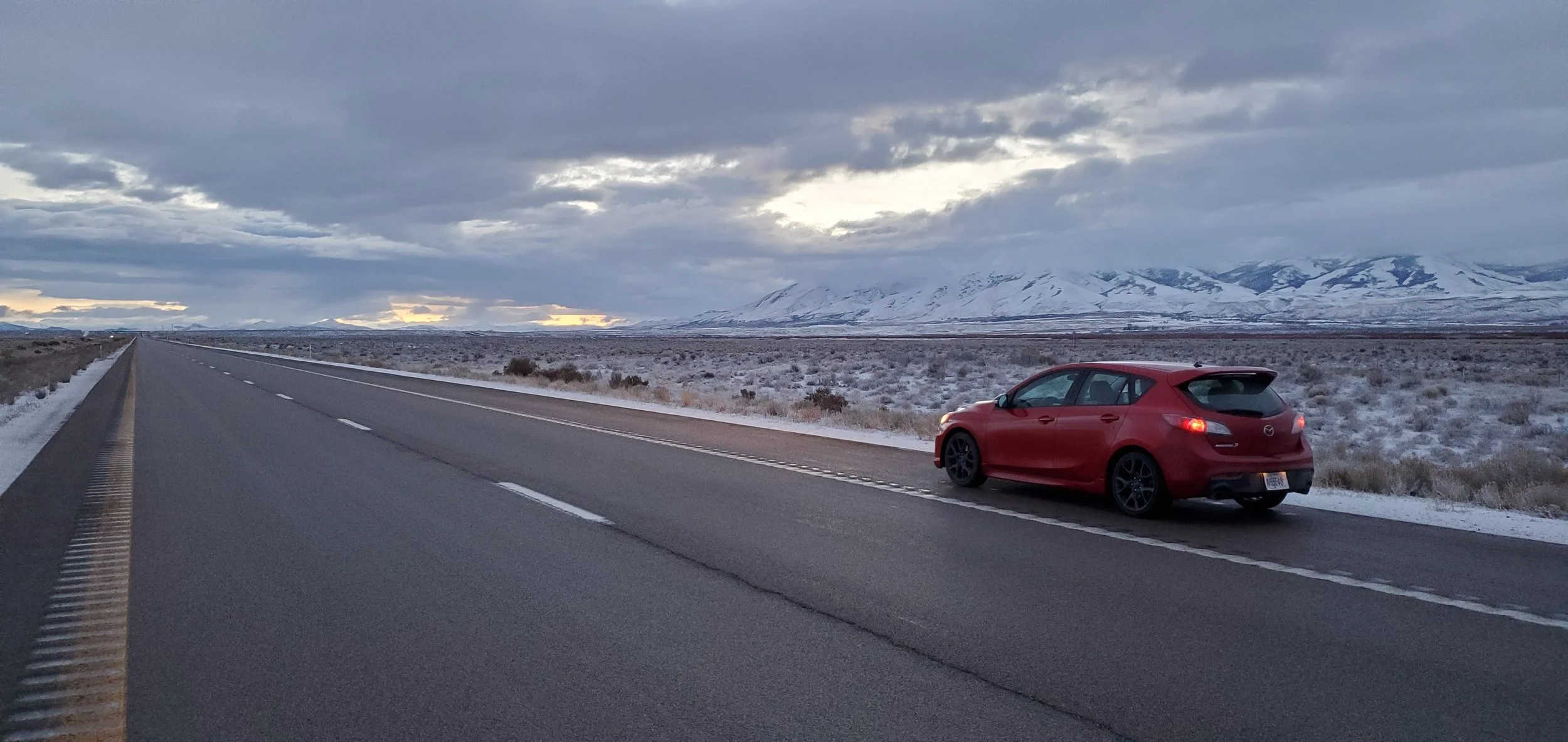I entered Utah shortly past midnight, and around 2 AM, I got tired enough to pull into a gas station parking lot to doze off for a few hours. The weather was freezing, so I left the Speed running, cranked the heat, and attempted to curl up in the backseat. She wasn't spacious, but it was enough. 6 or 7 AM rolled around, and despite the short sleep, I was juiced up and ready to drive again. The early morning snowy landscape yielded some truly spectacular sights. The chilly grey light illuminating miles of flat, empty ground with looming, snow-capped mountains in the distance. Believe it or not, I took plenty of pictures.